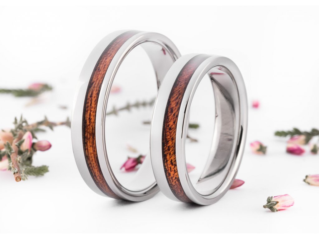 Jedinečné snubní prstýnky vytvořené z chirurgické oceli a mahagonu.